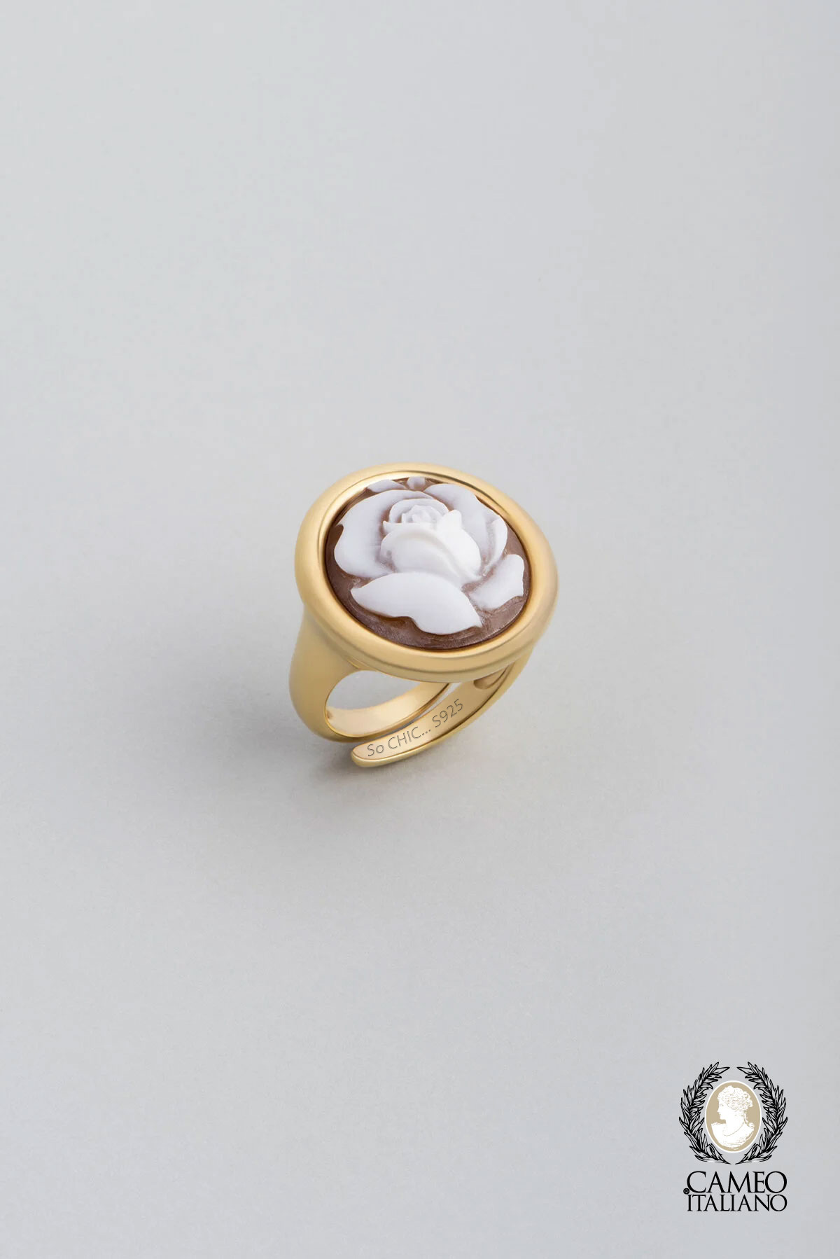 Cameo Italiano Beyaz Gül 18 Ayar Sarı Altın Kaplama Ayarlanabilir Gümüş Yüzük