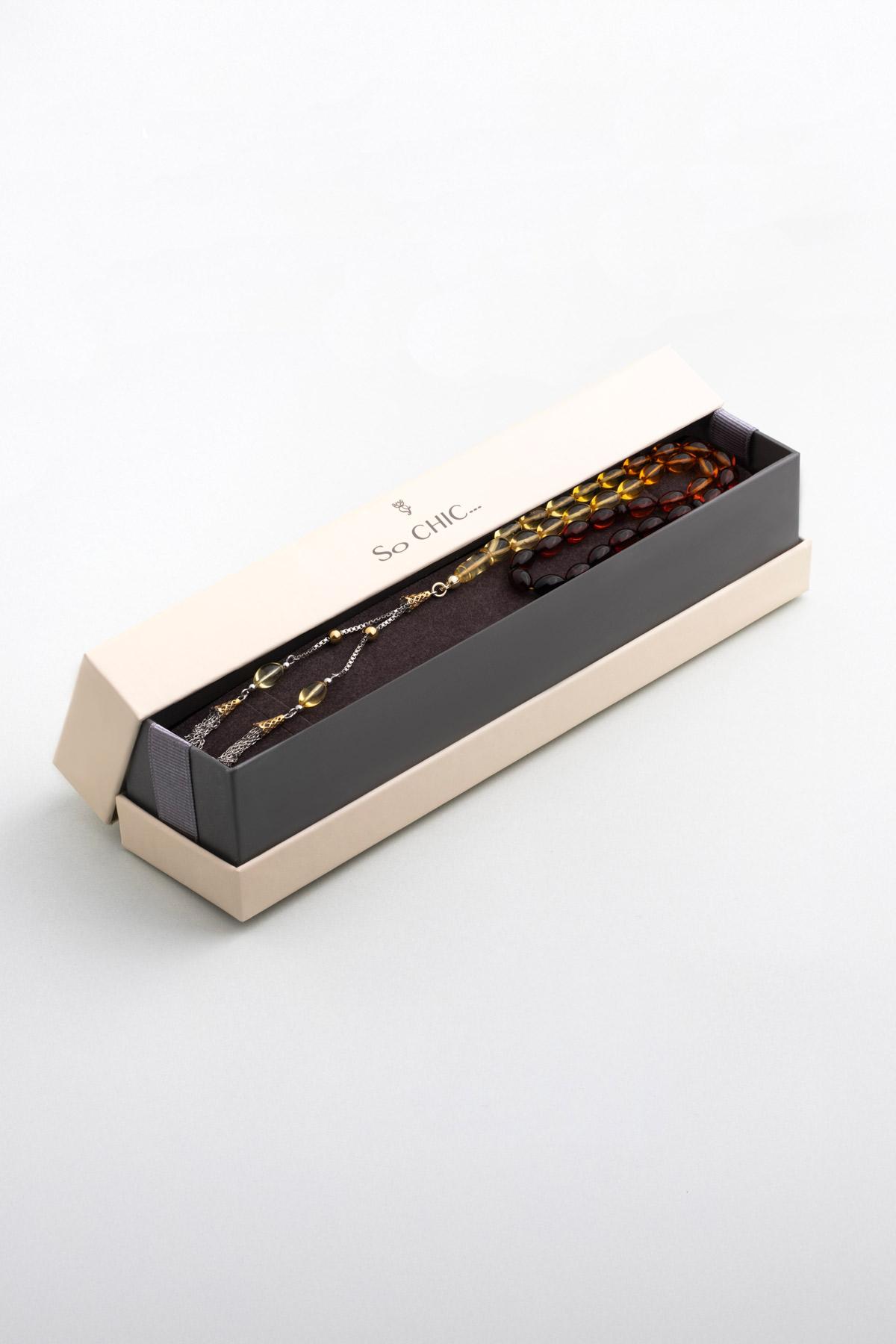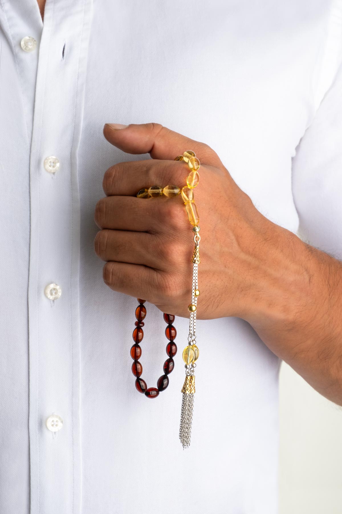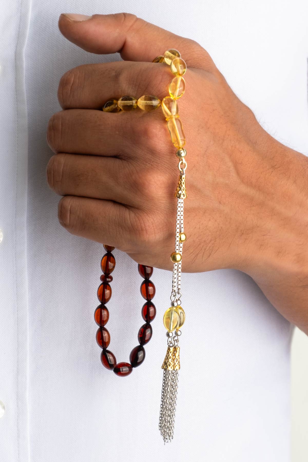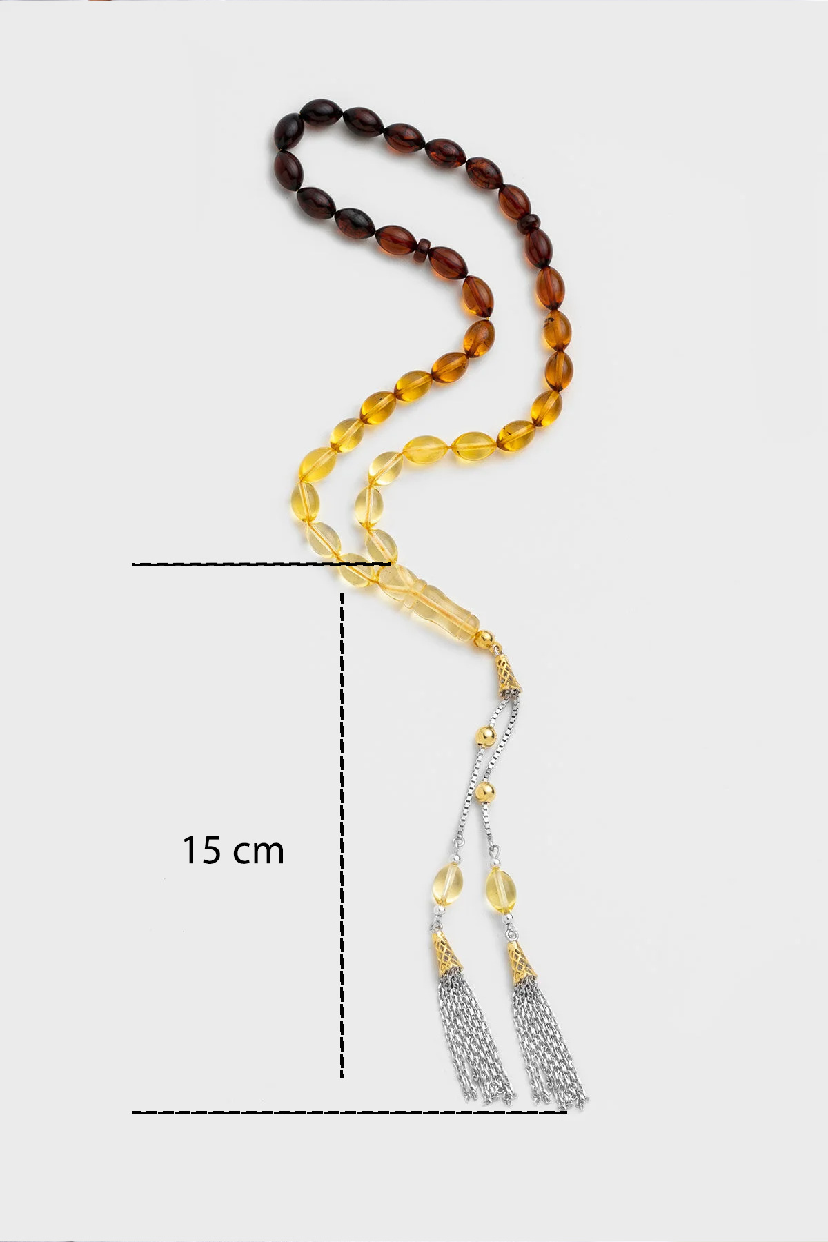 Doğal Kehribar Taşlı 18 Ayar Beyaz Altın Kaplama Gümüş Tesbih