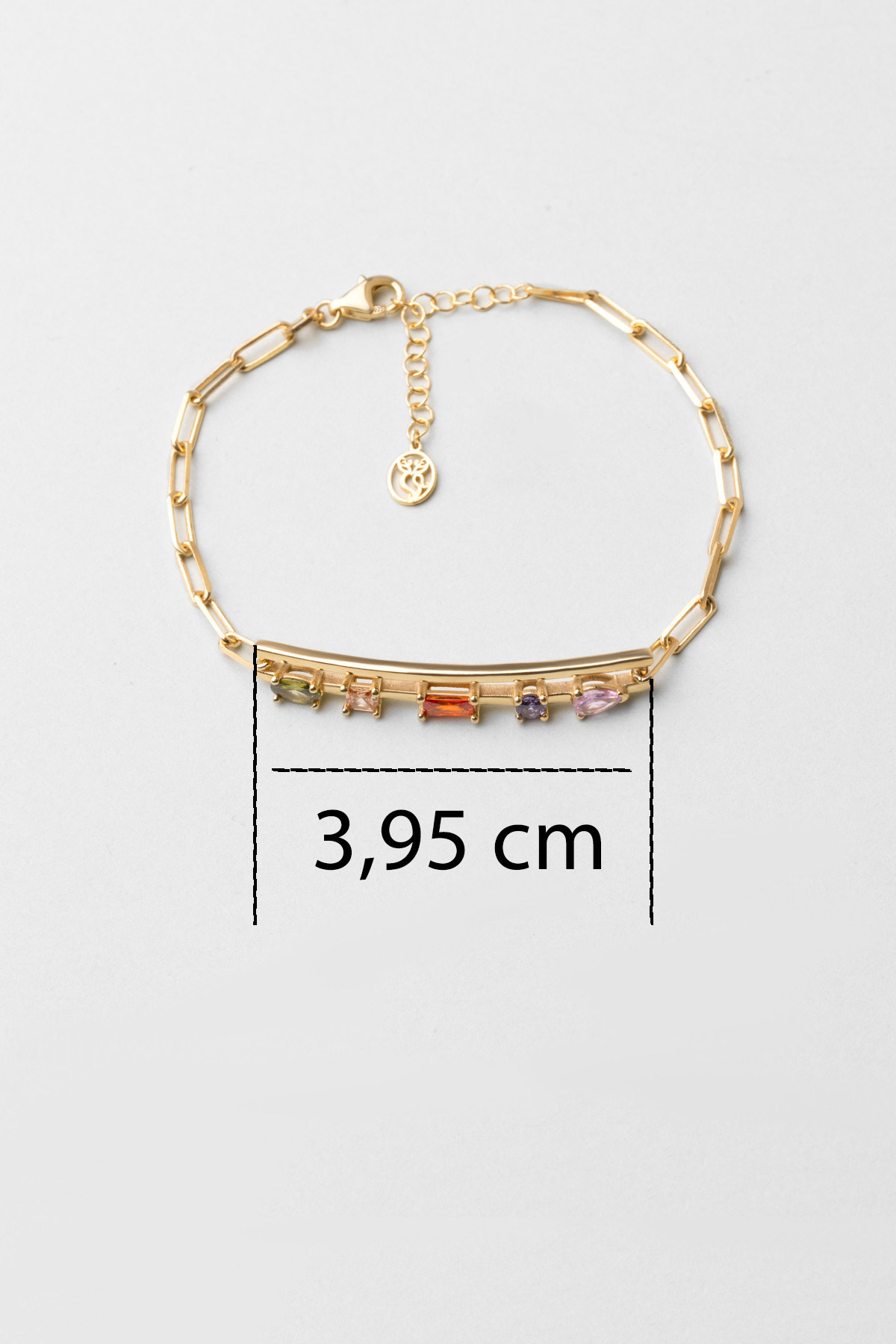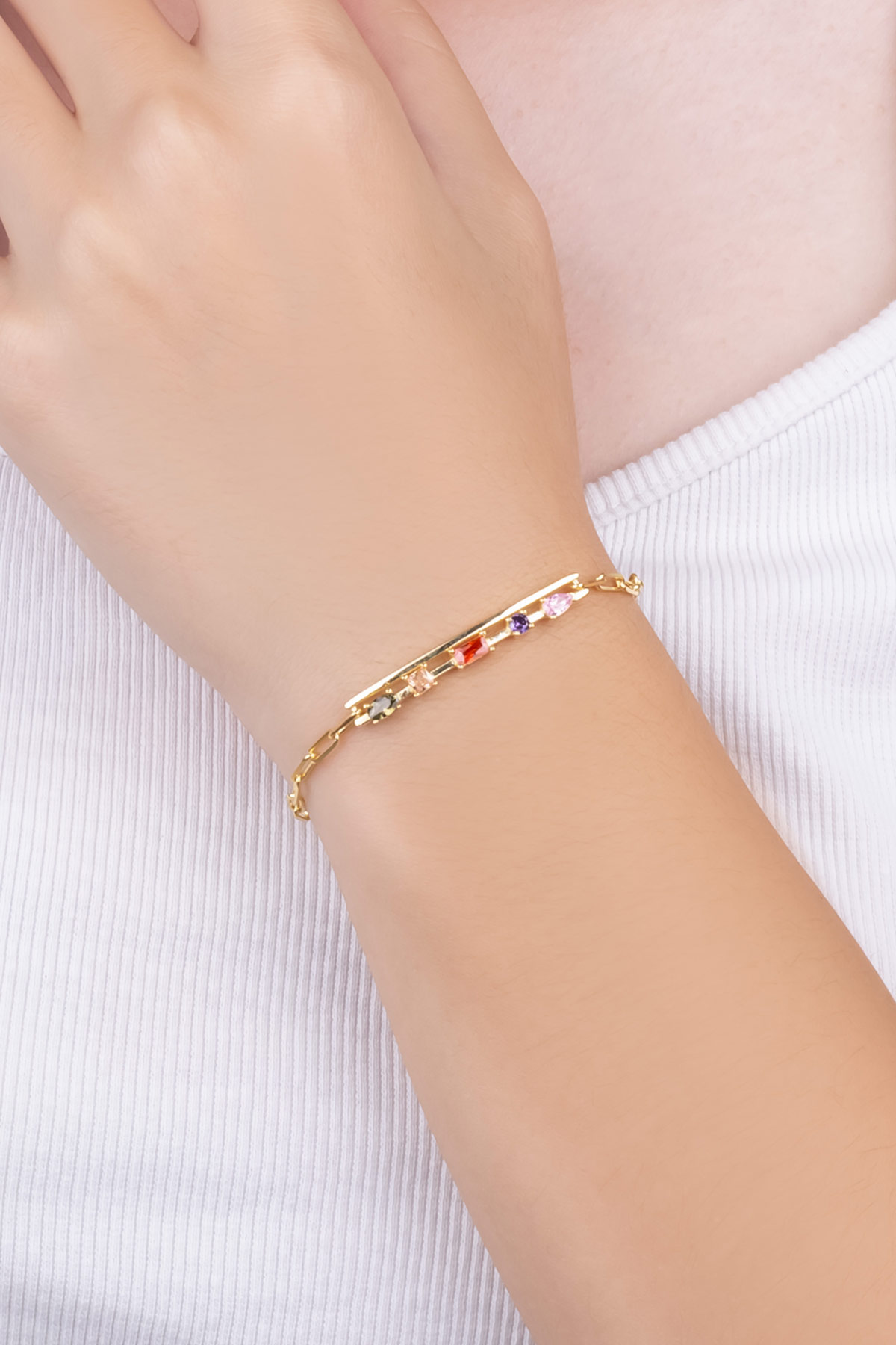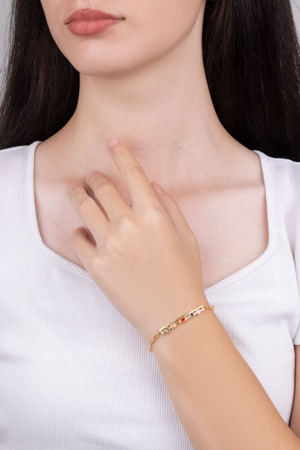 Renkli Taşlı 18 Ayar Sarı Altın Kaplama 19 Cm Gümüş Kelepçe Bileklik