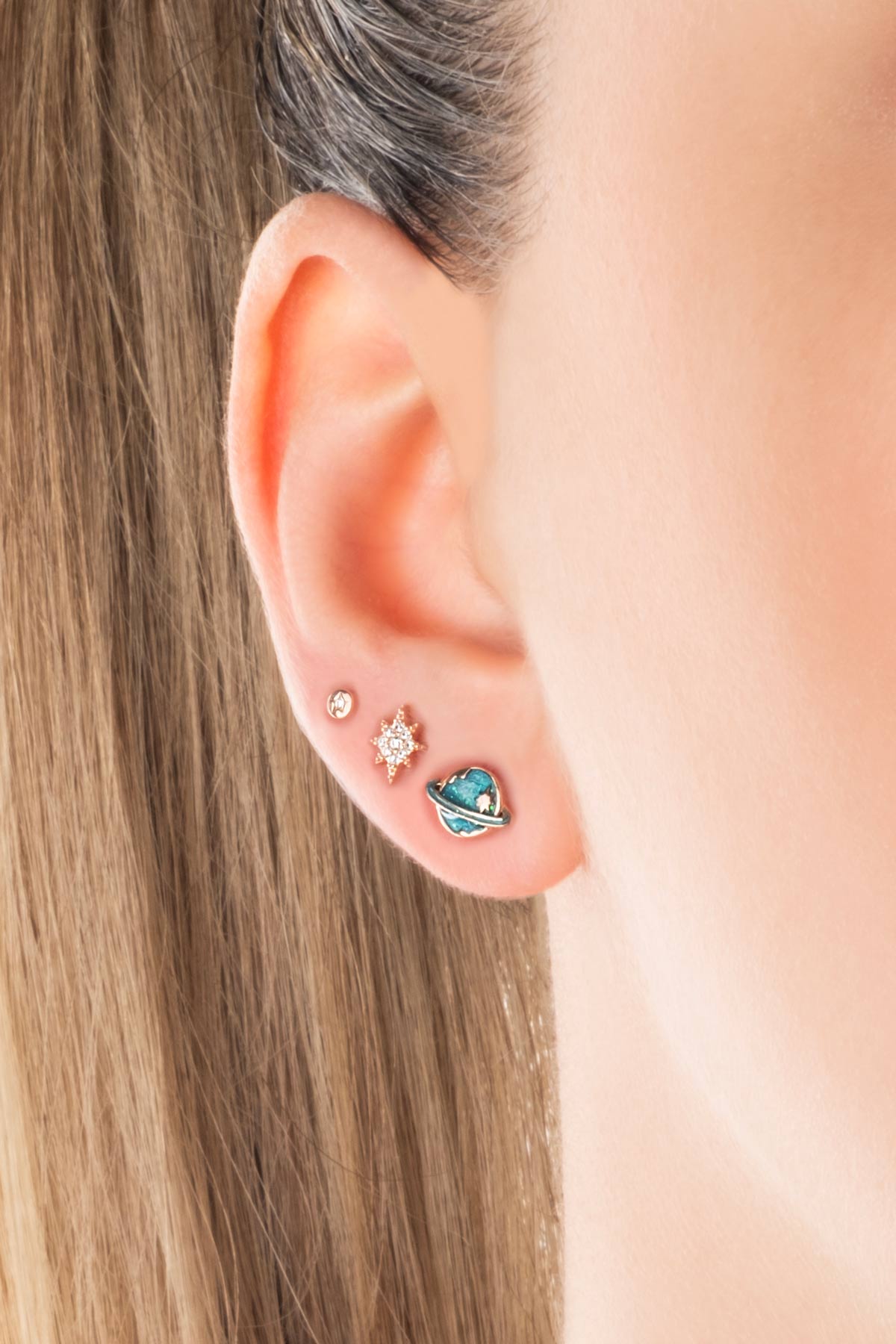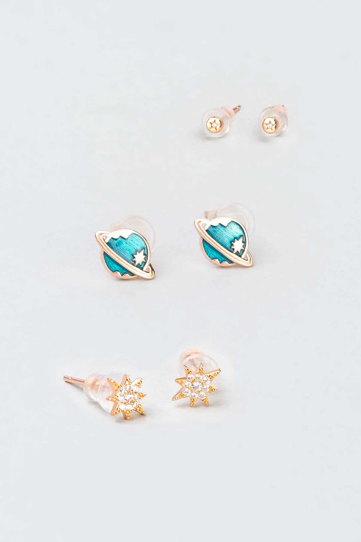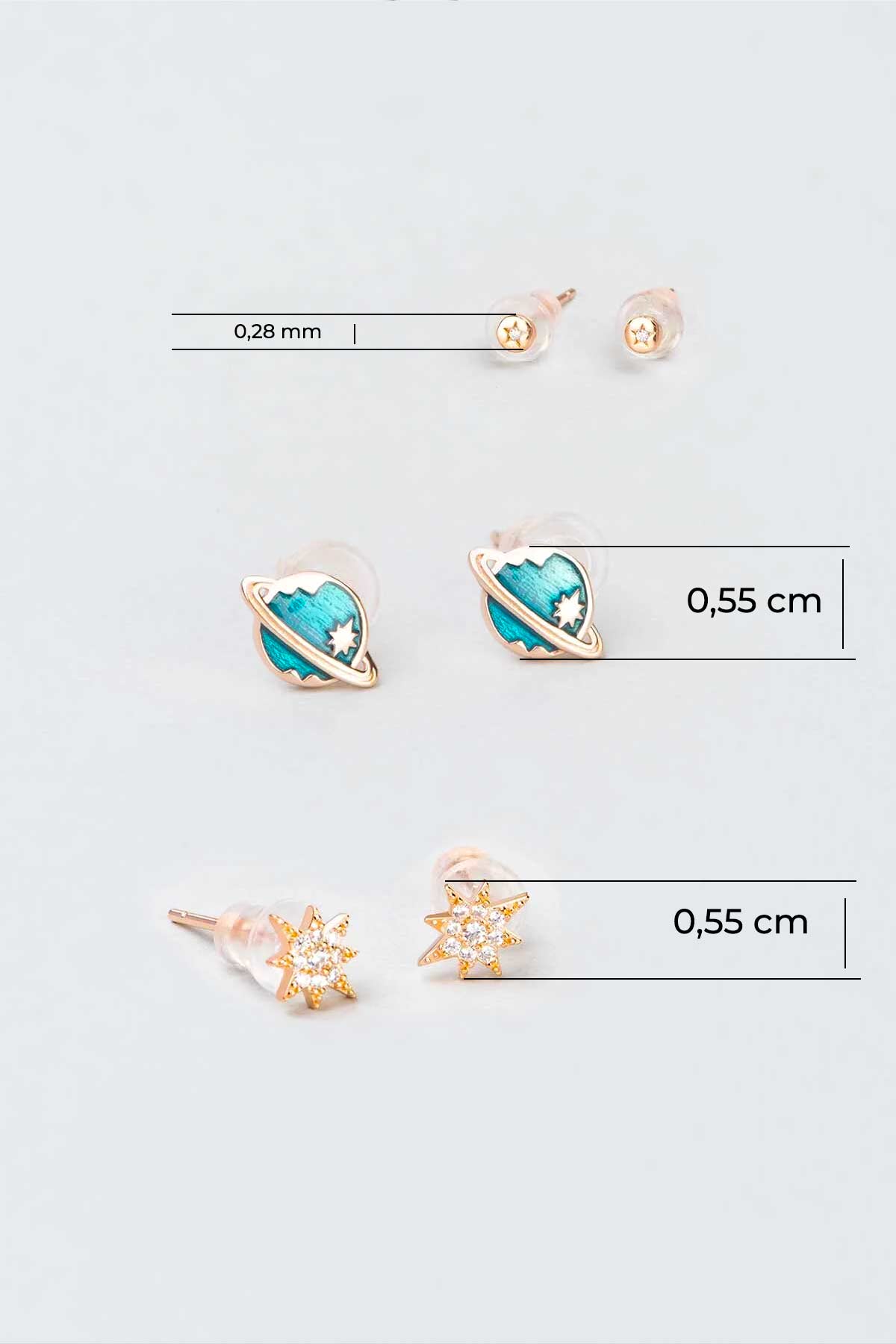 Satürn Yıldız Figürlü Taşlı 18 Ayar Rose Altın Kaplama Gümüş Üçlü Kombin Küpe Seti
