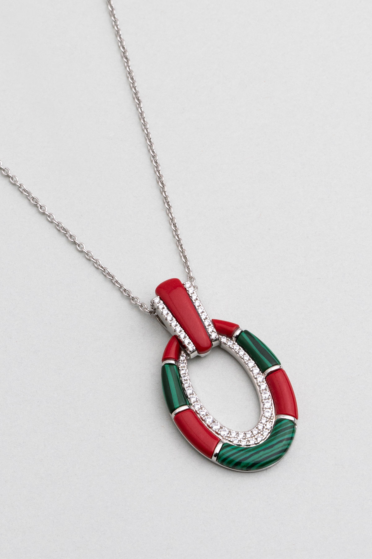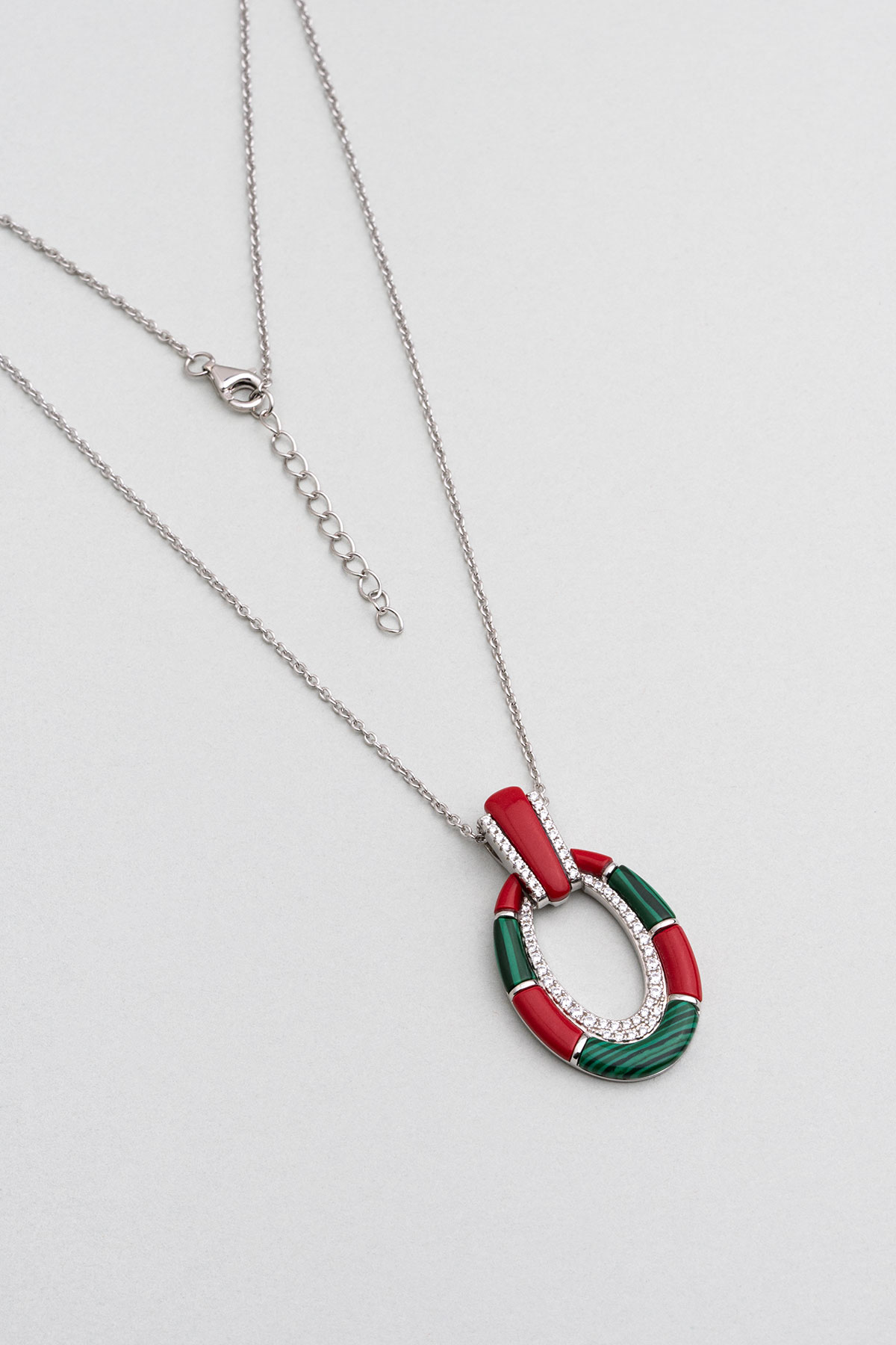 Malahit Ve Mercan Taşlı 18 Ayar Beyaz Altın Kaplama 45 Cm Gümüş Tasarım Kolye